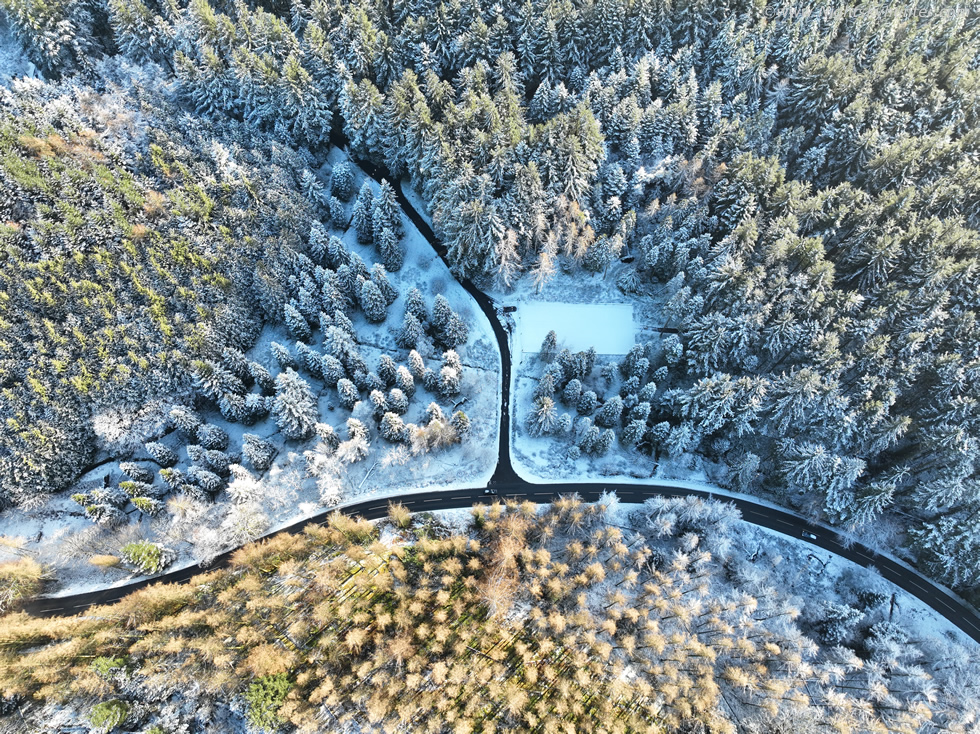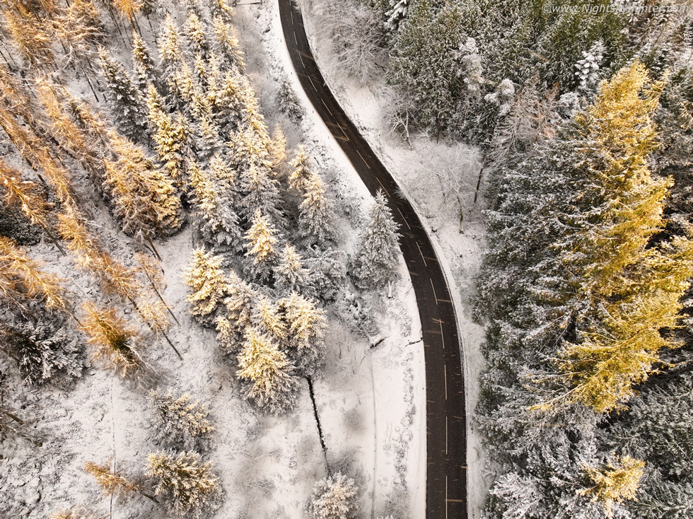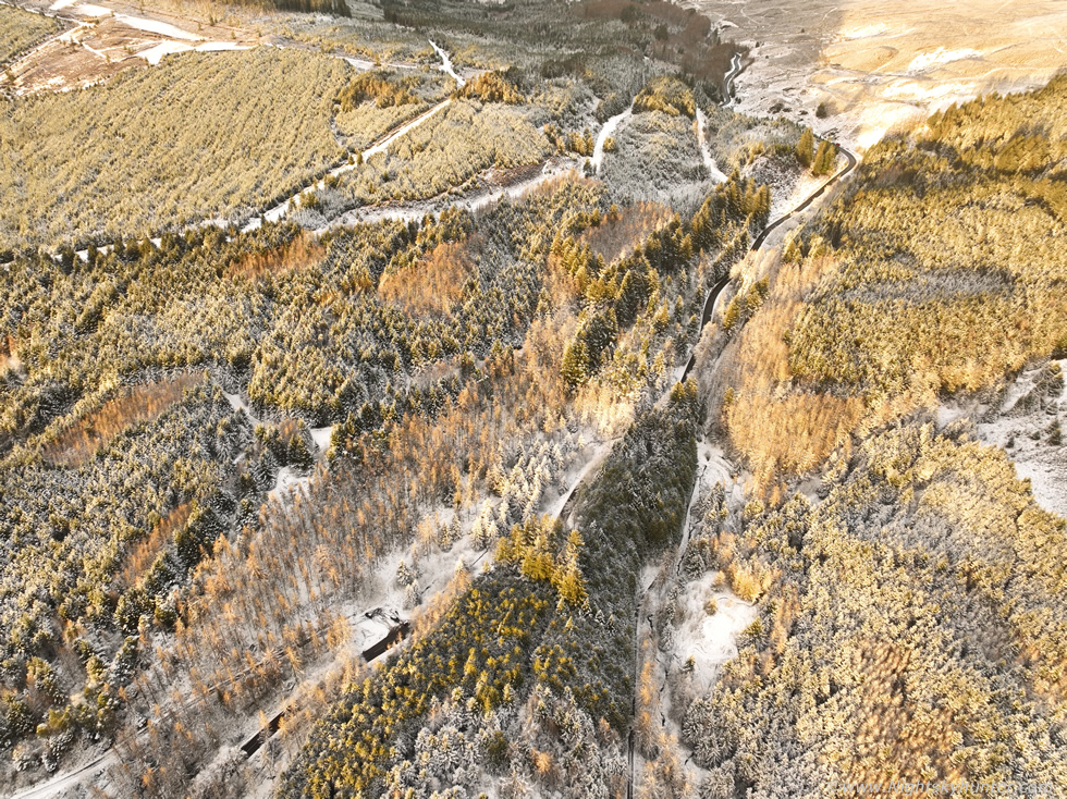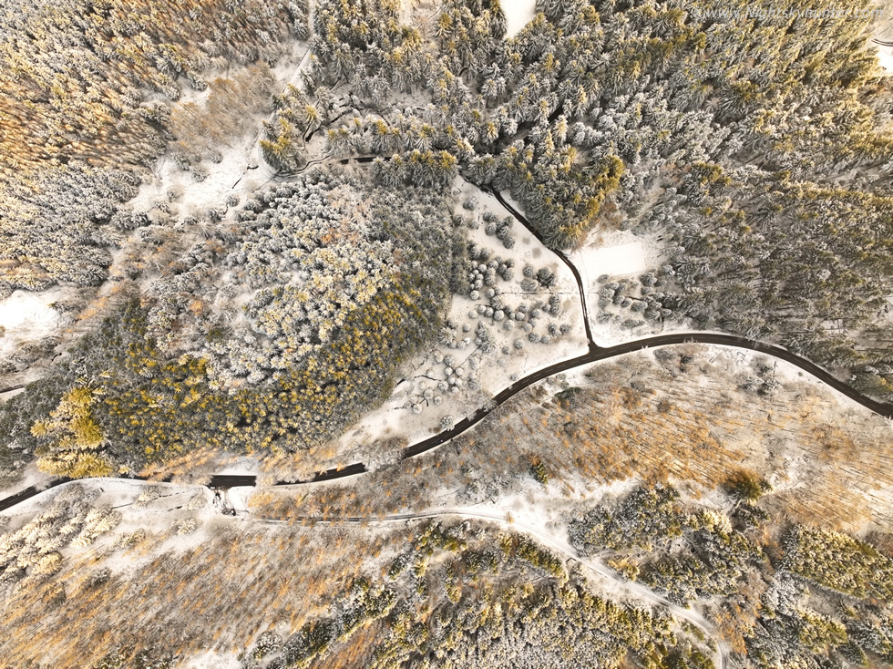 My favourite overhead image of the day, strong golden hour light on the trees and a new snow shower was moving in, you can see flurries of snow below the camera, nature's art.