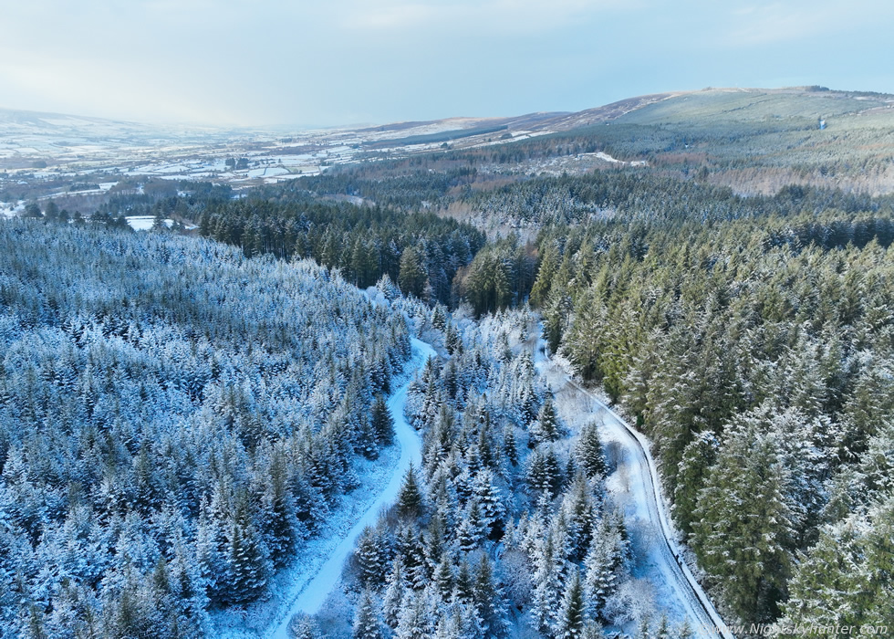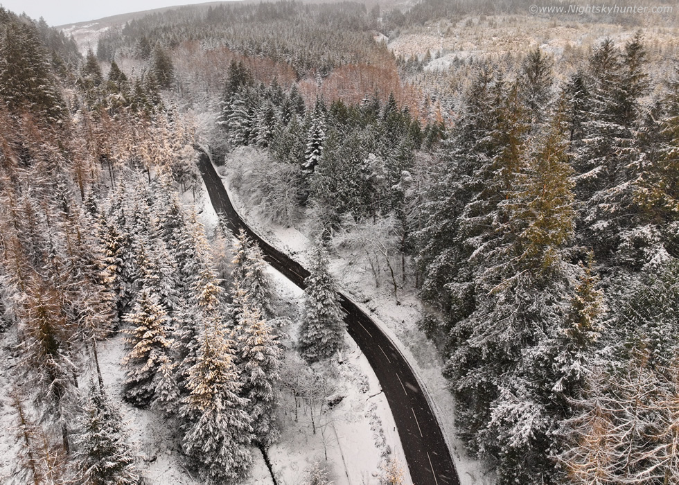 Even as we drove along the Omagh road we could tell the snow was melting on the hills in the bright Winter sunshine within the course of an hour however we pressed on into the forest and climbed to higher ground. We got lucky, the tall trees had blocked the sunshine and it was in these shadowed areas where snow remained and it was very cold. We got out to enjoy it and have a walk through some of the trails. It was actually beautiful with a couple of cm's of snow to enjoy, Rhua got out too, she's very old now, almost 100 years of age in Human terms so we wanted her to see snow again as this might be her last Winter to enjoy the white gold. Here's Roisin enjoying the snow in the forest, I was just using my phone for these ground images.
