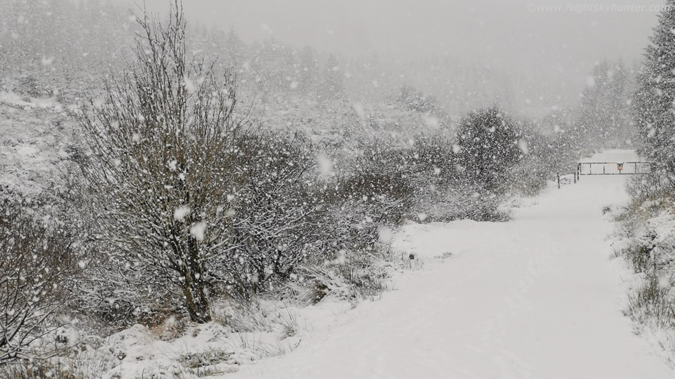 I only half slept that night in anticipation of the adventure to come, I was getting drips of adrenaline all night long which meant something was happening, I still wasn't even sure if Paul was going or not yet. I got up at 07.00 and checked radar, there had been many snow showers during the early hours passing down the west side of N. Ireland over the Omagh area. I checked messenger and Paul was already online, he was getting decent snow showers and was committed to going and I said I would join him, now it was happening for real. We agreed to meet in Omagh at 09.00, perhaps slightly earlier. The thing is this wasn't a simple case of driving out and getting images, we had to hike up a mountain. We would begin at Gortin Glen Forest Park, however there would be a barrier blocking the drive up which meant walking the entire way to the top, in snow, exposed to the elements, carrying camera gear and supplies. A 7.6km round trip, half of it up hill. Roisin and I had been walking a lot over the holidays and I had been doing bits and pieces of my own parkour exercises anyway so I knew I would be fine, however it's different in snow, at altitude, in wind chill, with no shelter and carrying gear so we knew what we were getting ourselves into. To be honest I was absolutely buzzing at the prospect of the adventure.